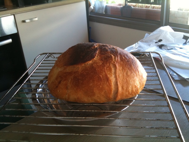 12. מוציאים את הסיר מהתנור. שולפים מתוכו את הלחם ונייר האפייה. מפרידים את הלחם מנייר האפיה. נותנים ללחם 20 דקות להתקרר (כן, אני יודע, זה קשה).